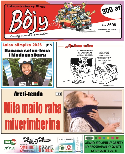 Bojy 29 janoary 2026 Written by Adnews on 29 janvier 2026 More in Bojy: 16 marsa 2026 16 mars 2026 14 marsa 2026 14 mars 2026 13 marsa 2026 13 mars 2026 Partager sur: