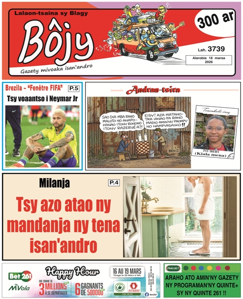 Bojy 18 marsa 2026 Written by Adnews on 18 mars 2026 More in Bojy: 17 marsa 2026 17 mars 2026 16 marsa 2026 16 mars 2026 14 marsa 2026 14 mars 2026 Partager sur: